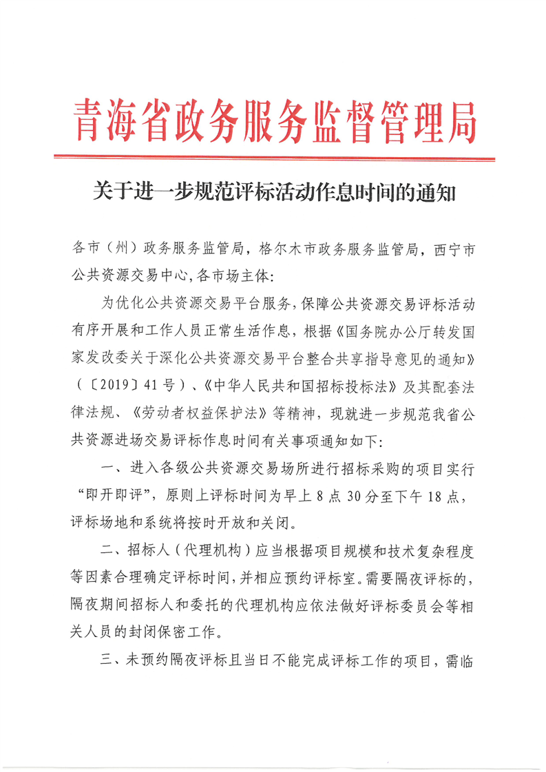 | 青海省政務服務監(jiān)督管理局關于進一步規(guī)范評標活動作息時間的通知 |