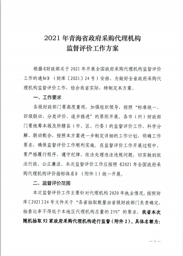 | 青海省財政廳關(guān)于印發(fā)《2021年青海省政府采購代理機構(gòu)監(jiān)督評價工作方案》的通知 |