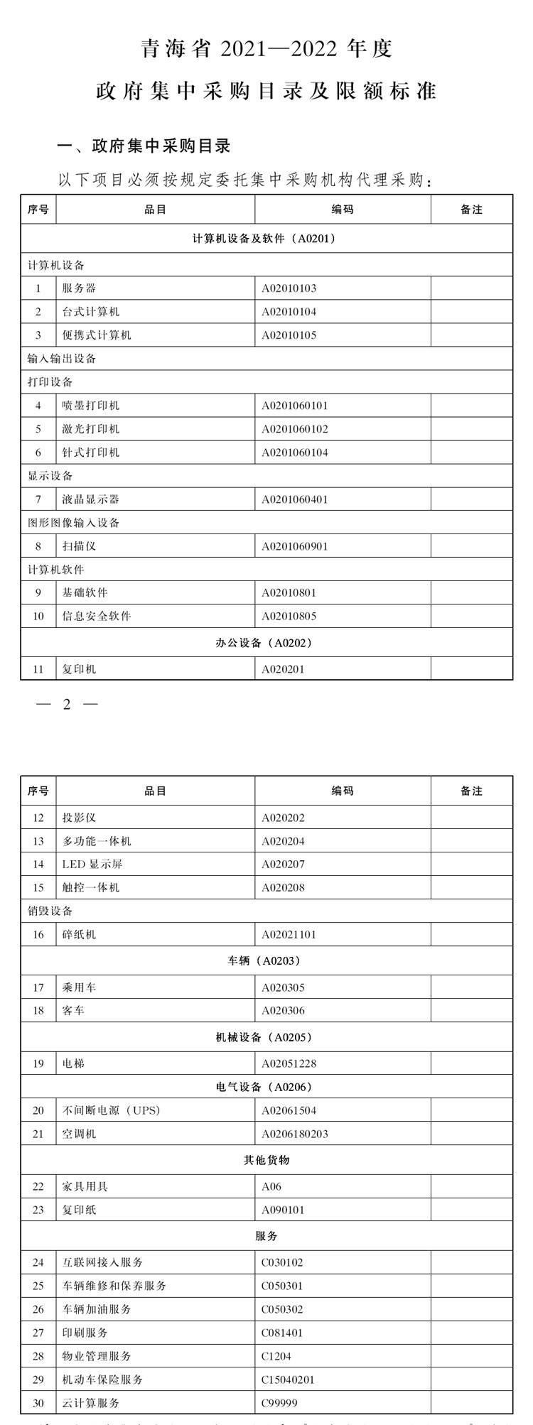 | 青海省人民政府辦公廳 關于印發(fā)青海省2021—2022年度政府集中 采購目錄及限額標準的通知 |