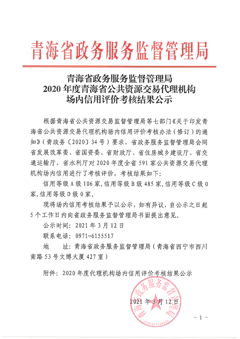 | 青海省政務(wù)服務(wù)監(jiān)督管理局2020年度青海省公共資源交易代理機(jī)構(gòu)場(chǎng)內(nèi)信用評(píng)價(jià)考核結(jié)果公示 |