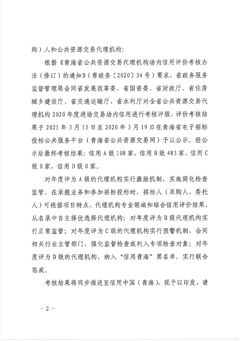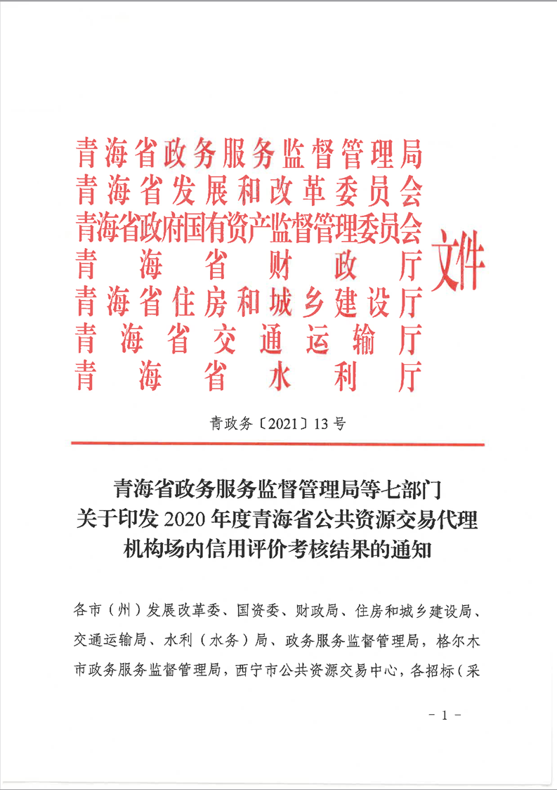 | 青海省七部門(mén)聯(lián)合印發(fā)《2020年度青海省公共資源交易代理機(jī)構(gòu)場(chǎng)內(nèi)信用評(píng)價(jià)考核結(jié)果的通知》 |